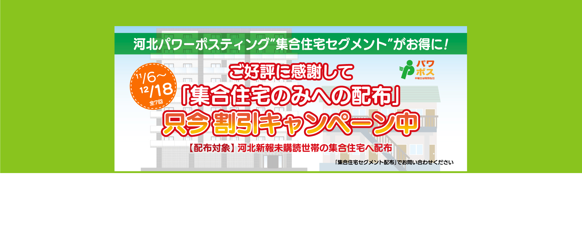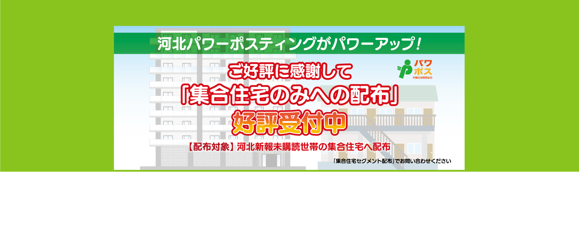 いつも新聞と一緒にお届けできる「新聞おりこみ広告」はもちろん、新聞無購読者にもアプローチできる「河北パワーポスティング」や、特定の世帯へアプローチできる「Kメール便」など、お客様のニーズに合わせたサービスをご提供いたします。